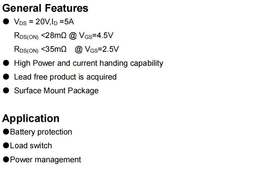 产品介绍1: ● VDS = 20V,ID =5A RDS(ON) <28mΩ @ VGS=4.5V RDS(ON) <35mΩ @ VGS=2.5V ● High power and current handing capability ● Lead free product is acquired ● Surface mount package