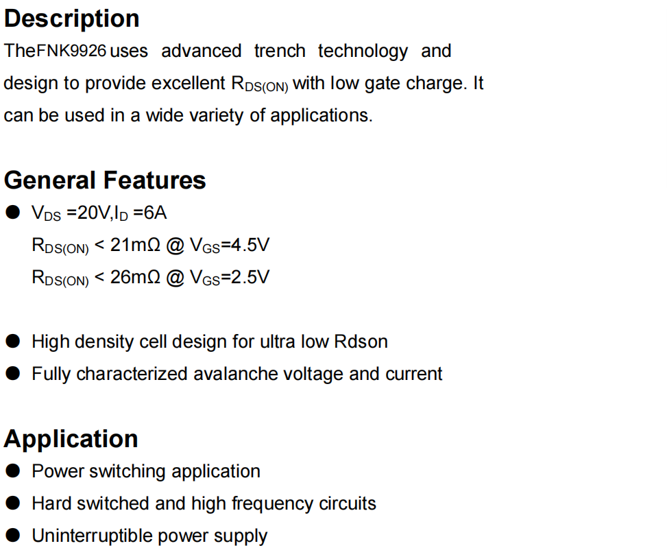 产品介绍1: ● VDS =20V,ID =6A RDS(ON) < 21mΩ @ VGS=4.5V RDS(ON) < 26mΩ @ VGS=2.5V ● High density cell design for ultra low Rdson ● Fully characterized avalanche voltage and current