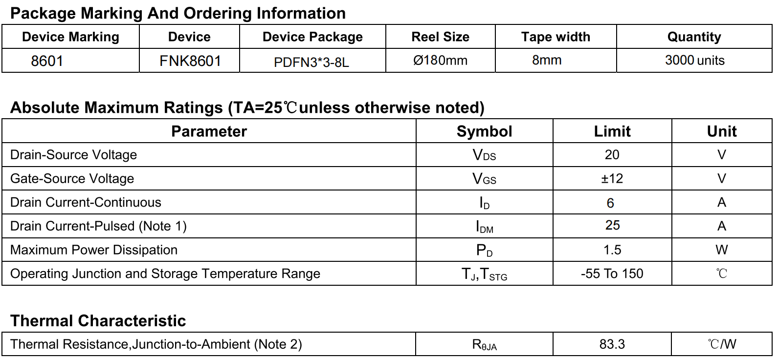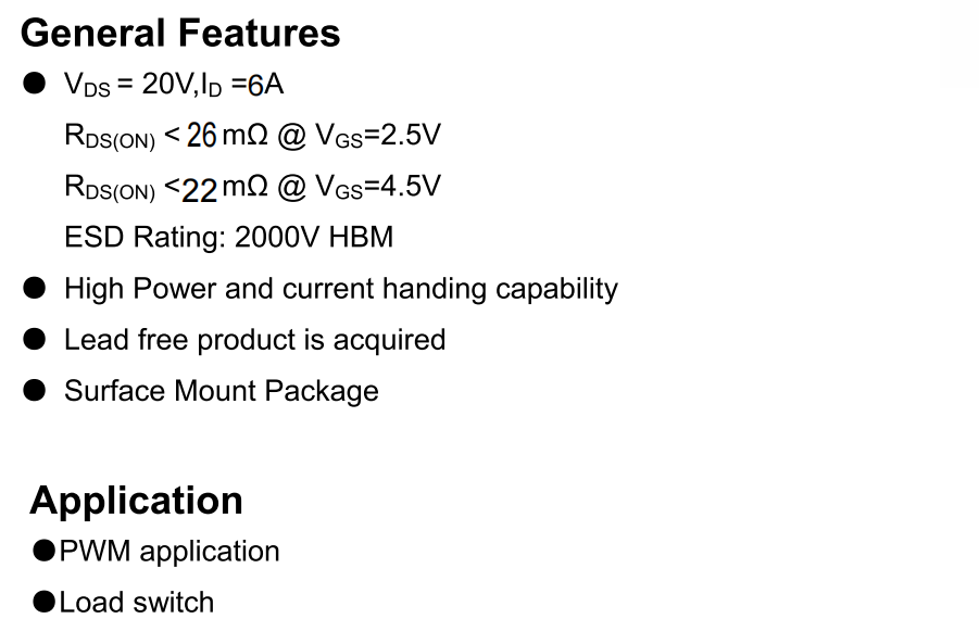 产品介绍1: ● VDS = 20V,ID =6A RDS(ON) < 26mΩ @ VGS=2.5V RDS(ON) <22mΩ @ VGS=4.5V ESD Rating: 2000V HBM ● High power and current handing capability ● Lead free product is acquired ● Surface mount package