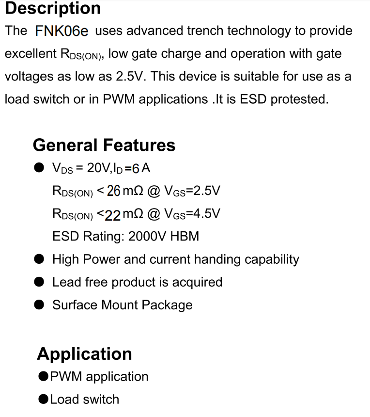 产品介绍1: ● VDS = 20V,ID = 6A RDS(ON) <26mΩ @ VGS=2.5V RDS(ON) < 22mΩ @ VGS=4.5V ESD Rating:2000V HBM ● High Power and current handing capability ● Lead free product is acquired ● Surface Mount Package