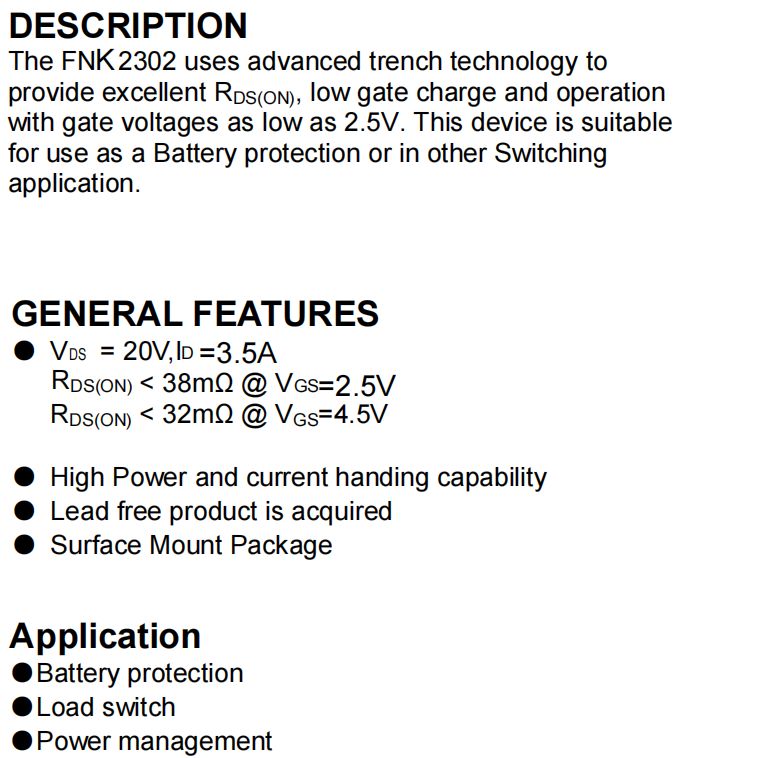 产品介绍1: ● VDS = 20V,ID = 3.5A RDS(ON) < 38mΩ @ VGS=2.5V RDS(ON) < 32mΩ @ VGS=4.5V ● High power and current handing capability ● Lead free product is acquired ● Surface mount package
