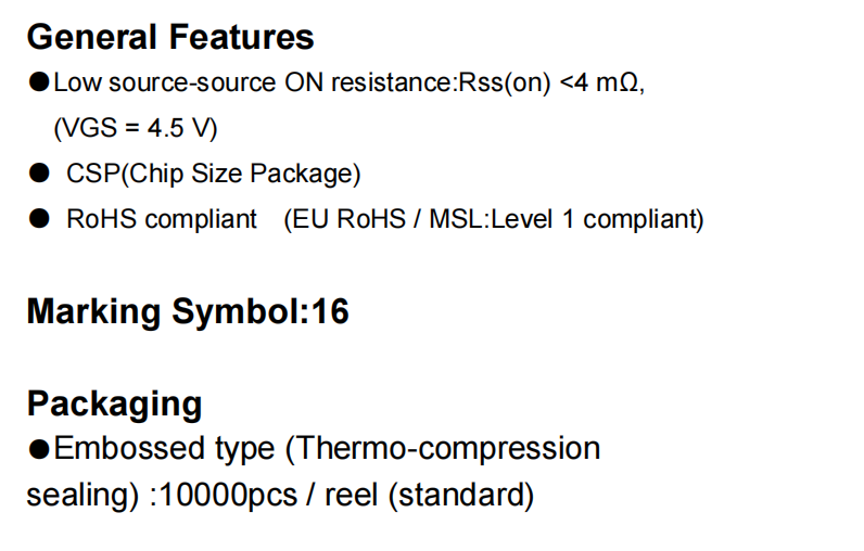产品介绍1: ● Low source-source ON resistance: Rss(on)<4mQ, (VGS=4.5V) ● CSP(Chip Size Package) ● RoHS compliant (EU RoHS/MSL: Level 1 compliant)