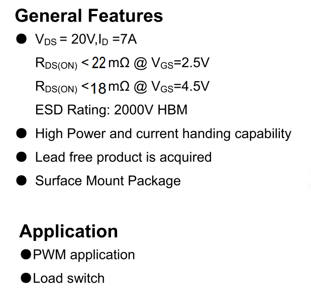 产品介绍1: ● VDS = 20V,I = 7A RDS(ON) <22m Ω @ VGS=2.5V RDS(ON) <18m Ω @ VGS=4.5V ESD Rating:2000V HBM ● High power and current handing capability ● Lead free product is acquired ● Surface mount package