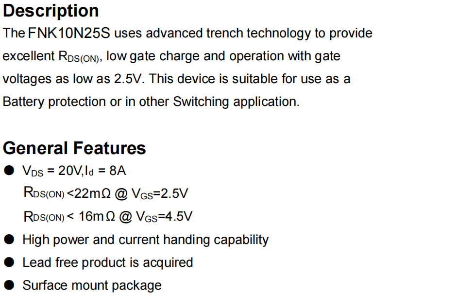 产品介绍1: ● VDS = 20V,I = 8A RDS(ON) <22m Ω @ VGS=2.5V RDS(ON) <16m Ω @ VGS=4.5V ● High power and current handing capability ● Lead free product is acquired ● Surface mount package