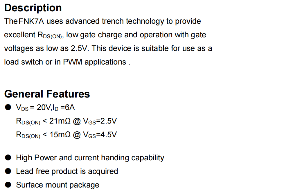产品介绍1: ● VDS = 20V,ID =6A RDS(ON) < 21mΩ @ VGS=2.5V RDS(ON) < 15mΩ @ VGS=4.5V ● High Power and current handing capability ● Lead free product is acquired ● Surface Mount Package