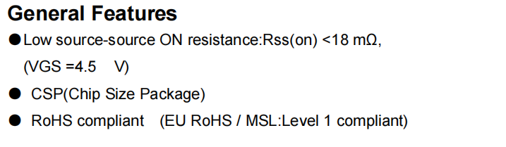 产品介绍1: ● Low source-source ON resistance: Rss(on)<18 mQ, (VGS=4.5V) ● CSP(Chip Size Package) ● RoHS compliant (EU RoHS/MSL: Level 1 compliant)