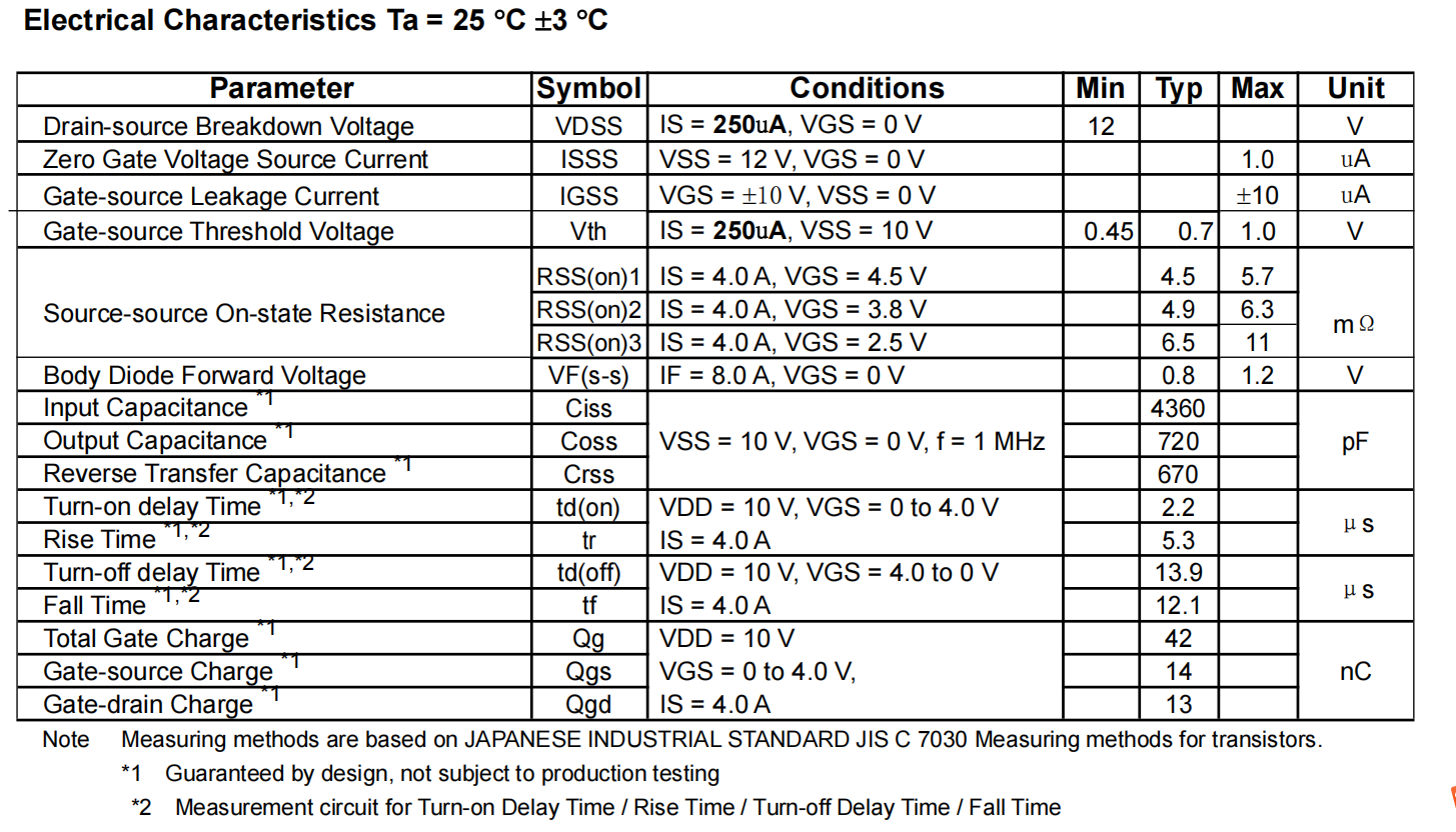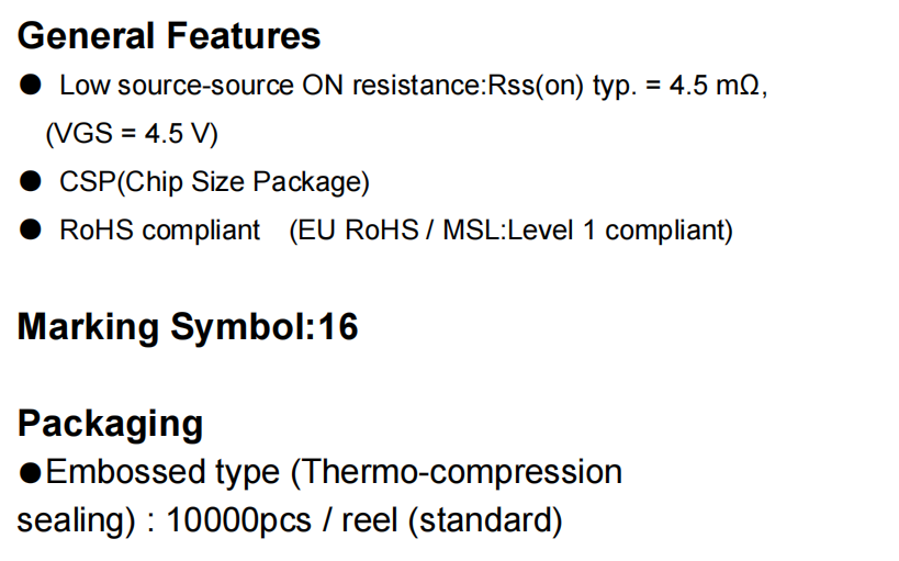 产品介绍1: ● Low source-source ON resistance: Rss(on) typ.=4.5mQ, (VGS=4.5V) ● CSP(Chip Size Package) ● RoHS compliant (EU RoHS/MSL: Level 1 compliant)