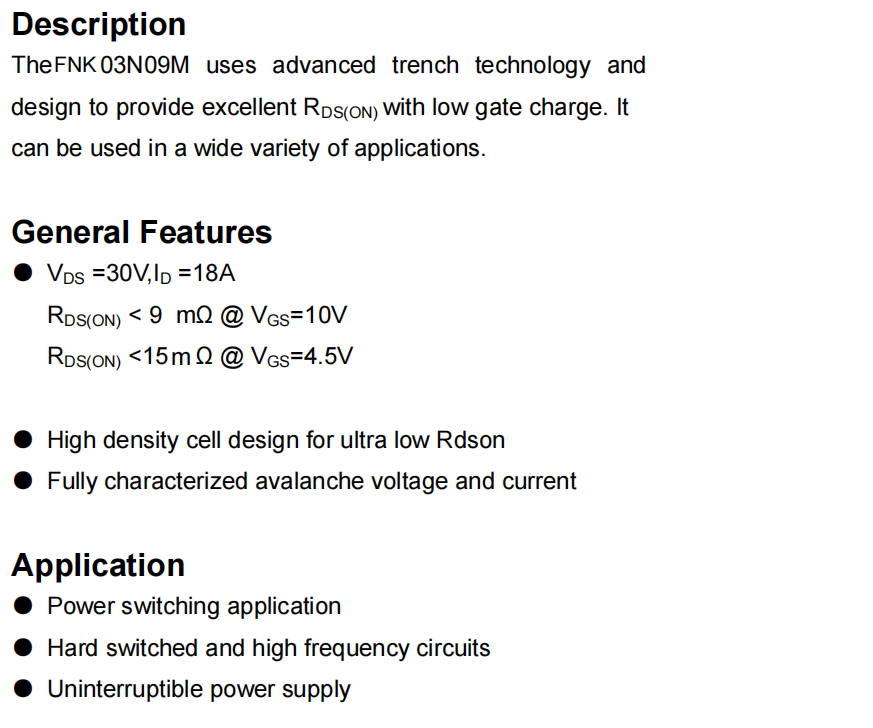 产品介绍1: ● VDS =30V,ID =18A RDS(ON) < 9 mΩ @ VGS=10V RDS(ON) <15m Ω @ VGS=4.5V ● High density cell design for ultra low Rdson ● Fully characterized avalanche voltage and current