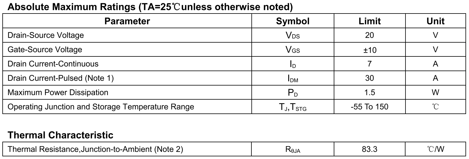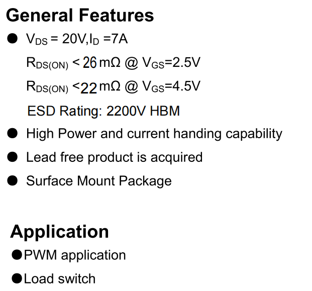 产品介绍1: ● VDS = 20V,I = 7A RDS(ON) <26m Ω @ VGS=2.5V RDS(ON) <18m Ω @ VGS=4.5V ESD Rating:2000V HBM ● High power and current handing capability ● Lead free product is acquired ● Surface mount package