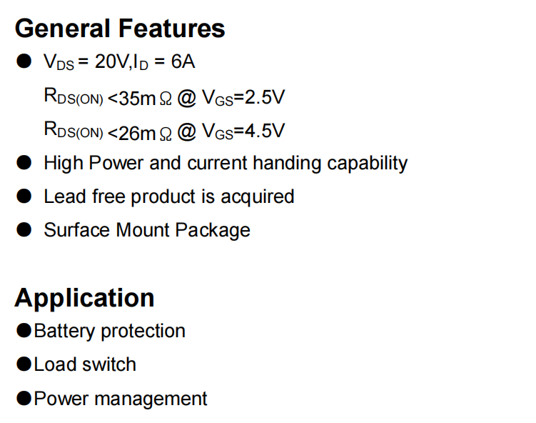 产品介绍1: ● VDS = 20V,ID =6A RDS(ON) < 35mΩ @ VGS=2.5V RDS(ON) <26mΩ @ VGS=4.5V ● High power and current handing capability ● Lead free product is acquired ● Surface mount package